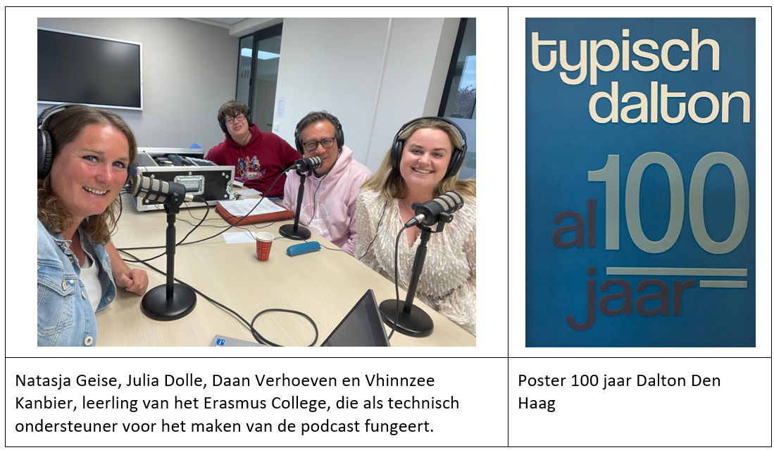 Sinds 2023 maakt de NDV (Nederlandse Daltonvereniging) de podcast ‘de daltondialoog’. Inmiddels is het stokje van Rudger Minnee overgenomen door Natasja Geise. In de podcast van juli 2025 is aandacht besteed aan 100 jaar daltononderwijs in Nederlands. Julia Dolle en Daan Verhoeven van Dalton Den Haag vertellen hierover.