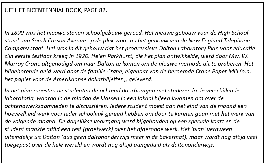 En dan, tot slot, nog dit: de mecenas die Helen Parkhurst naar Dalton haalde, was mw. W. Murray Crane, de vrouw van de directeur van de Paper Mill. Dat was blijkbaar iemand met moderne ideeën over onderwijs. We zijn haar eeuwig dankbaar.
