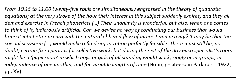 In de inleiding bij Parkhursts Education on the Dalton Plan noemt prof. Nunn het inzicht dat we zouden krijgen ‘alarmerend’ en ‘bevreemdend’ als we plotseling eens stil zouden staan bij het zo vanzelfsprekende schoolrooster waar we op scholen dagelijks mee werken. Hij laat tot op het belachelijke aan toe zien hoe kunstmatig het werken met een klassikaal rooster is. Hij vraagt zich af of we geen manier kunnen bedenken om beter aan te sluiten bij de natuurlijke eb en vloed van interesse en activiteit van kinderen.