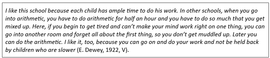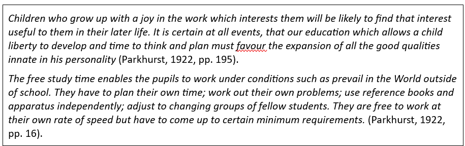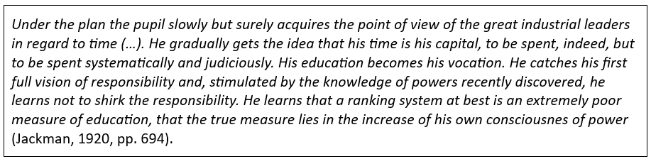 Parkhurst noemt haar Dalton Plan ‘an efficiency measure’. Ze vindt dat tijd op school wijs besteed moet worden en dat kan alleen als we tegemoet komen aan de verschillen tussen leerlingen. Kinderen moeten de vrijheid krijgen om in eigen tempo te leren. Als we ze daarvoor niet de kans geven, is onderwijs voor haar zelfs een vorm van slavernij.