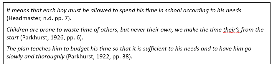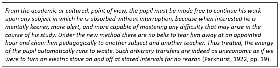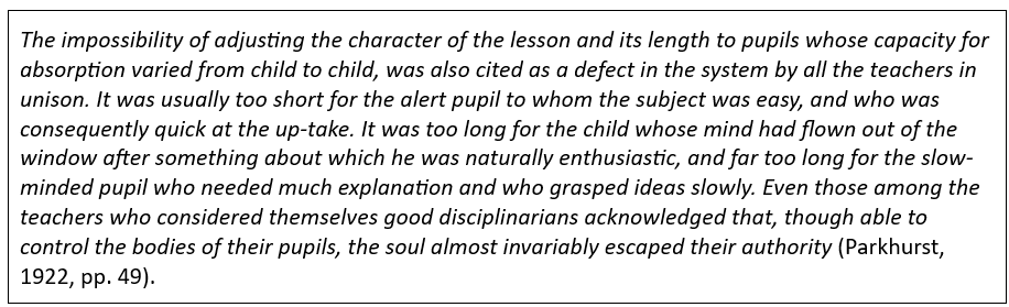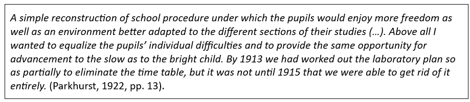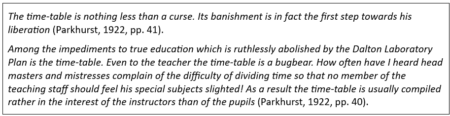 Deze citaten maken inzichtelijk waarom Parkhurst haar gedachtegoed ontwikkelde. Als er iets in het onderwijs is dat niet effectief en efficiënt is, dan is het wel een strak schoolrooster. Want natuurlijk verschillen kinderen van elkaar. Ze verschillen in leeftijd en snelheid van ontwikkeling. Ze hebben verschillende bio-ritmes en werken op verschillende niveaus en in verschillende tempi; ze verschillen in interesses en talenten en hebben verschillende voorkeuren in de manier van leren.