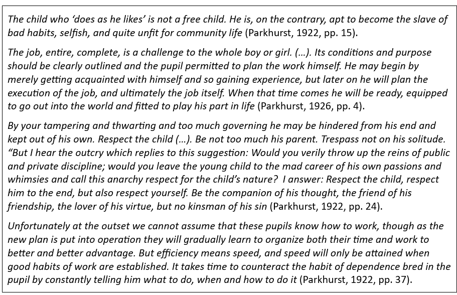 Het vrij laten van leerlingen om hen verstandig om te leren gaan met de beschikbare tijd en hen te laten oefenen met het dragen van verantwoordelijkheid, betekent niet dat we kinderen maar ‘los’ moeten laten en laten doen wat in hen opkomt. Zelfsturend leren is niet zelfsturend te leren (Sins (red), 2018). Kinderen die maar doen wat in hen opkomen, zijn volgens Parkhurst slaaf van slechte gewoonten en van hun impulsen.