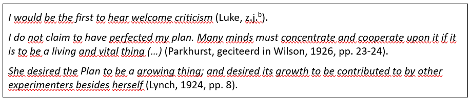 Parkhurst geeft nog een voorbeeld van toen ze op de school in Dalton met docenten het gesprek voerde over het ‘oude’ systeem. Unaniem hadden leraren al in 1920 (!) de mening dat het onmogelijk is om de aard van de les en de lengte ervan aan te passen aan leerlingen, die zo van elkaar verschillen.