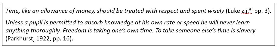 Emancipated from its tyranny, Mary’s equation will change as she eliminates antipathy to, or weakness in, those subjects. But as long as her problem can be expressed in the terms of the above equation, she should devote half of her three available hours every day to Mathematics and French, and only the remaining half to the other four subjects. If she is stronger in French than in Mathematics then the one-and-one-half hours should be divided accordingly. Mary, will, however, be free to choose which subject she will take up first, and she will go into the laboratory consecrated to that subject. Having chosen it at the moment when her interest in it is keen, she will do better work and do it more quickly too. Once in the laboratory Mary proceeds to study as an individual, but if she finds other members from Form II there she works with them. This is the rule of the laboratory under the Dalton Plan. It subdivides and reduces the large class group and it creates a small group of pupils doing intensive work, which stimulates discussion and exercises social influence. The educative value of such small groups is immense in giving an atmosphere to the laboratory, in providing occasions for social adjustment and experience. It provides invaluable play of mind upon mind. As Mary has entered that laboratory voluntarily, and can leave it for another when she feels inclined, no problems of discipline arise. Her mind comes in with her and goes out with her, disciplined by interest in the subject, harnessed the whole of it to her job. No time is wasted, for though the general time-table has gone Mary has, in consultation with her adviser, made a time-table for herself. This is very important, especially in the case of the younger children, in order to inculcate the value of time. To spend it in supplying our mental and moral needs is to put it to the wisest use (Parkhurst, 1922, p. 42-43).