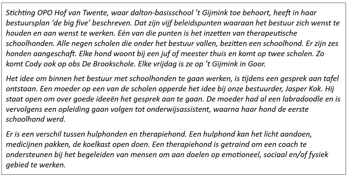 De scholen van het bestuur hebben allemaal een schoolhond. Er zijn maar liefst zes honden! Dus het is zeker niet zo dat een schoolhond alleen maar past bij een daltonschool. Maar het past wel heel goed bij dalton en bij hoe we op onze school leren.