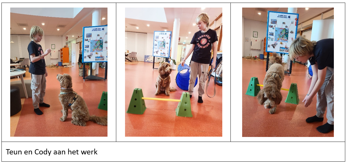 De hond heeft aangegeven hoe we het moesten doen, want als ik heel druk ging doen en niet duidelijk was en precies wist en zei wat er moet gebeuren, dan ging het parcours niet goed. Zo leerde ik steviger in mijn schoenen te staan en beter te plannen wat Cody en ik samen moesten doen. Dat hielp me ook bij het plannen van mijn werk. Ik leerde mijn werk beter overzien en maakte me daardoor minder zenuwachtig. Ik gebruik nu wat ik met Cody geleerd heb, ook in de klas.