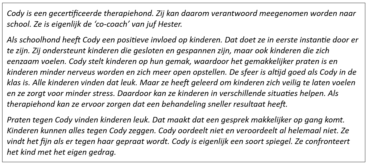 Cody helpt ook wel eens als iemand in de klas moet huilen. Dan wordt er wel gezegd: “Wil jij Cody de klas laten zien?” Dan stopt het huilen vaak al gauw. Cody helpt bij het je afleiden als er zware dingen zijn.