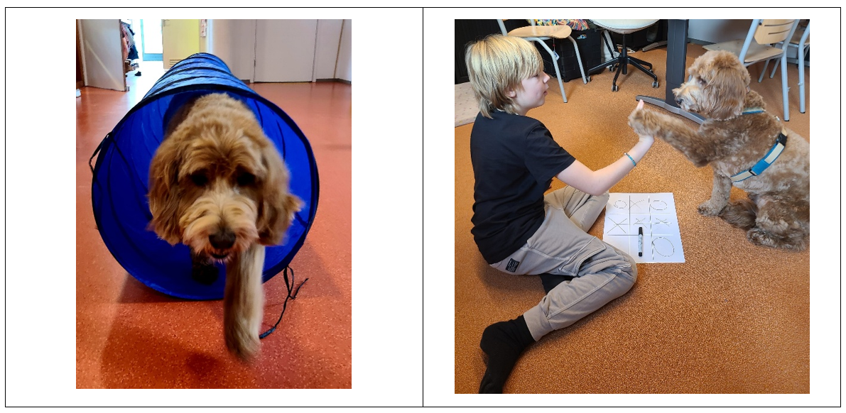 We hebben thuis zelf ook een labradoodle. Dat is ook een lieve en vrolijke hond, maar die heeft niet geleerd om schoolhond te zijn. Mijn eigen hond voelt ook wel aan wanneer ik verdrietig ben, heeft ook verschillende woordjes geleerd en je kunt hem wel wat opdrachten geven. Verder voelt hij ook goed aan wanneer we ‘uit’ gaan of gaan eten, of wanneer er iemand op bezoek komt. Maar als wij allemaal onrustig zijn, is onze hond dat ook. Daarom is mijn eigen hond minder geschikt als schoolhond.