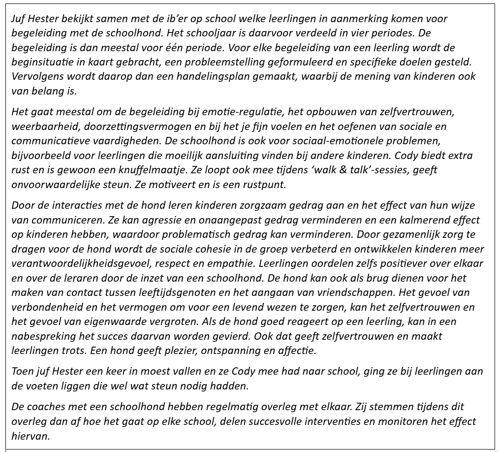 Aan het eind van de periode waarin ik met Cody mocht werken, was het wel slikken dat het stopte. Ik heb het heel leuk gevonden en ik miste het werken met haar. Maar gelukkig is ze elke vrijdag op school en kan ik altijd even binnenkomen om haar te knuffelen. Het is natuurlijk fijn dat ik nu gewoon beter kan doorwerken. Ze zal zich mij wel blijven herinneren. Je ziet soms dat Cody zijn poot tegen het glas van de deur zet, als ze buiten kinderen ziet spelen, waarmee ze gewerkt heeft.