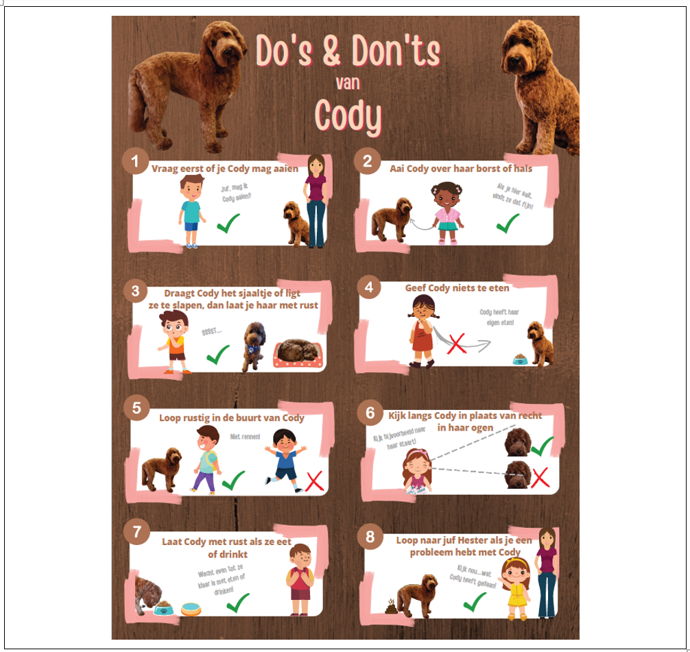 Alle kinderen van onze school kennen Cody. Als er een pauze is, loopt Cody vaak ook op het plein. Dan kunnen alle kinderen even rustig Cody aaien of aandacht voor haar hebben, maar dat moeten ze wel altijd eerst vragen. Cody kwispelt veel. Ze vindt het leuk als ze aandacht krijgt.