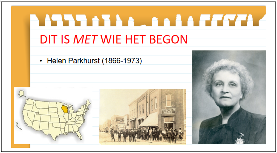Parkhurst op bezoek Op verzoek van de Helen Parkhurstschool is Parkhurst zelf van 23-4 t/m 2-5-1952 in Nederland. Ze bezoekt met Dorothy R. Luke de opening van de school in Rotterdam en geeft een aantal lezingen in het land.