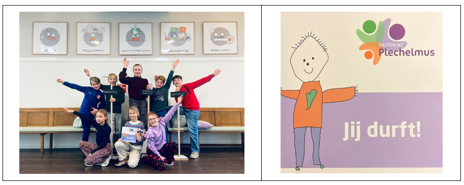 Aan Jij durft! hebben ook kinderen van ons dalton ikc gewerkt. Leerlingen uit groep 1, 2 en 8 hebben getekend en een leerling uit groep 2 heeft de woorden van de kernwaarden nageschreven. Daarover is een mooie discussie ontstaan. Per ongeluk staat er namelijk een spelfout in het woord ‘verantwoordelijkheid’. Het is geschreven zonder de letter ‘r’. Onder de leerlingen uit de leerlingenraad, de ouders uit de OR en MR en in het team is daar flink over gesproken. Uiteindelijk vond iedereen, dat de fout er in moest blijven staan, want fouten maken ‘moed’ als je op z’n daltons werkt. Er staat in het prentenboek dat je van fouten maken, leert.