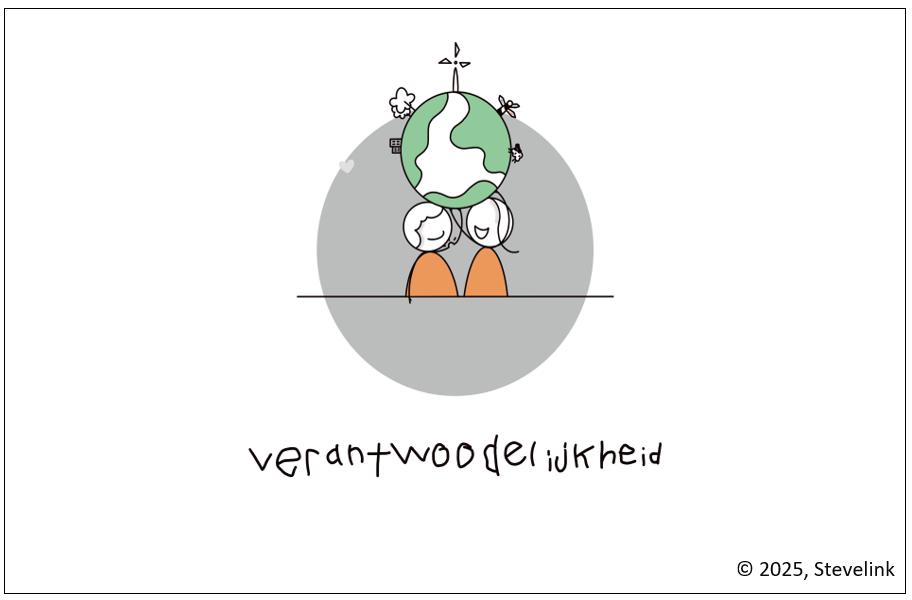 De fout in het woord verantwoordelijkheid staat in het boekje, maar ook in de hal van de school waar de getekende kernwaarden in fotolijsten aan de muur hangen. Dat levert met bezoekers en ouders vaak interessante gesprekken op, die over de essentie gaan van wat we op ons IKC willen stralen, gaan.