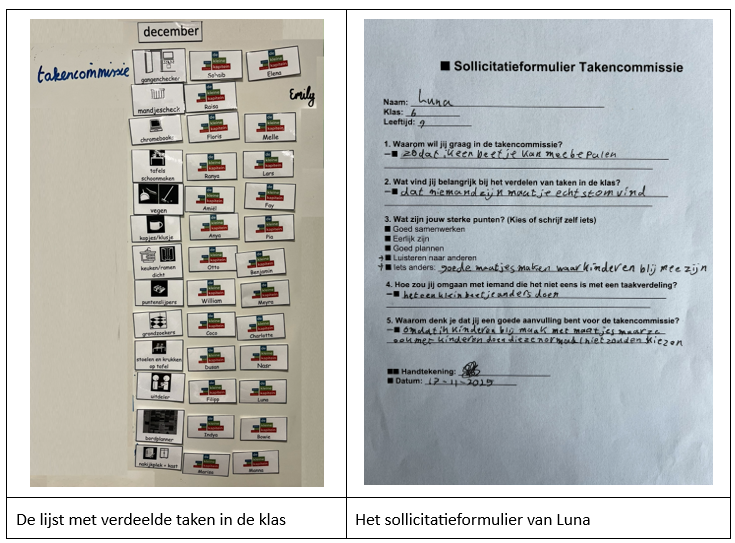 Er waren meer kinderen die het formulier ingevuld hadden, maar wij zijn uitgekozen. Wij zijn dus tot aan de voorjaarsvakantie de takencommissie. “Ik had niet verwacht dat ik uitgekozen zou worden”, zegt Luna. “Ik wilde het graag, maar ik wist niet of mijn sollicitatie goed genoeg was.”