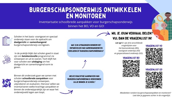 De komende jaren gaan we schoolbrede aanpakken van burgerschapsonderwijs ontwikkelen en onderzoeken, in nauwe samenwerking met scholen. Hiervoor willen we inventariseren welke krachtige aanpakken er binnen de onderwijspraktijk al zijn en waar het onderwijsveld tegen aan loopt. Deze inventarisatie is onderdeel van een onafhankelijk wetenschappelijk onderzoek naar burgerschap in het funderend onderwijs.