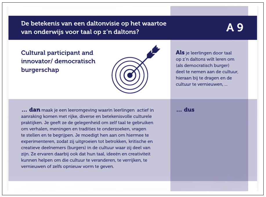 De bovenstaande illustratie is een voorbeeld. We zien kaart A-9 met het ontwerpprincipe dat gaat over hoe we in ons taalonderwijs eraan bij kunnen dragen dat leerlingen als democratische burgers actief gaan deelnemen aan de samenleving: een aspect dat voortvloeit uit de daltonvisie.